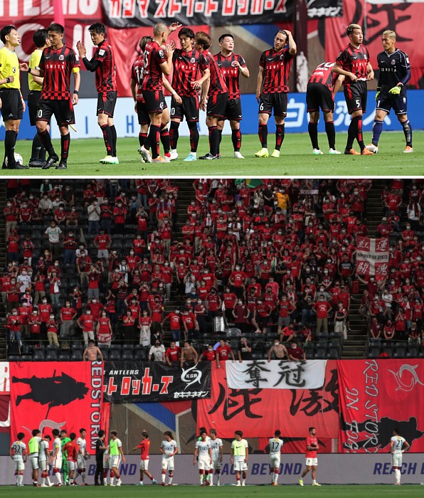 上:下段写真/下位の札幌とスコアレスドローに終わり、あいさつに行った鹿島の選手たちに、遠来のサポーターから厳しい叱責の声が飛んだ