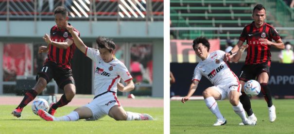 上:右側写真/日本代表で大活躍して戻ってきた名古屋MF相馬(左)と負傷が癒えて先発に戻ってきた札幌のMFルーカス・フェルナンデスとの対決は何度もあった。後半13分、相馬の突進をファールで止めたルーカス・フェルナンデス