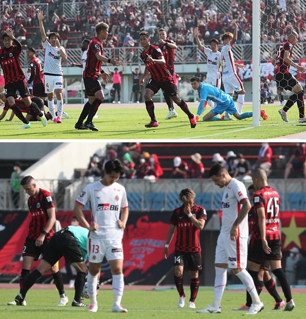 上:上段写真/後半追加タイム2分、土壇場で引き分けに持ち込む同点ゴールを決めた札幌MF青木(中央)が「してやったり!」の表情、その左DF宮澤、右FWミラン・トゥチッチ。名古屋GKランゲラックがひざをついたまま悔しそう、DF中谷(4番)、MF稲垣、内田らが手を上げてオフサイドを主張している