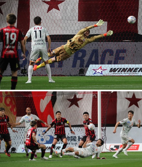 上:左側下段写真/後半15分、札幌青木のシュートはGK権田(中央)がはじき、ボールがこぼれたのを見て再度ボールに向かう