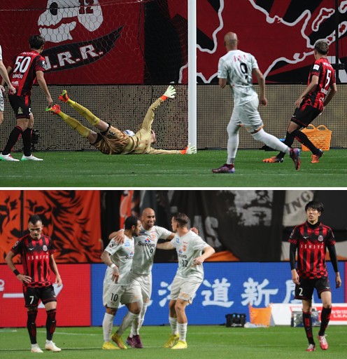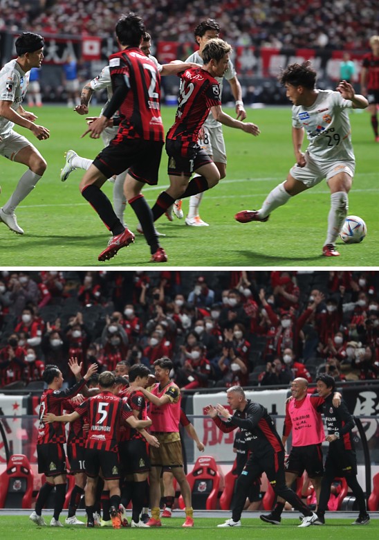 上:左側写真/後半追加タイム2分、札幌MF青木の決勝ゴールに叫ぶペトロビッチ監督