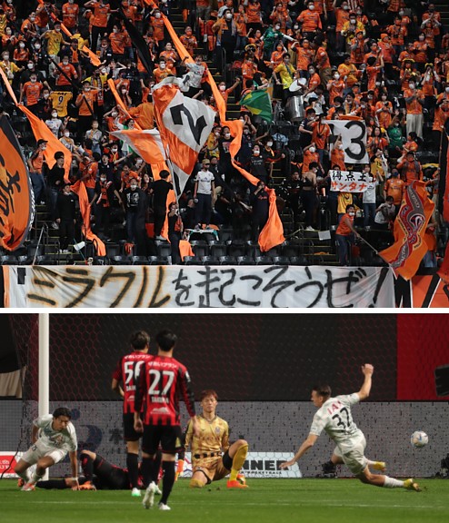 上:上段写真/後半4分、サンタナの同点ゴールに「ミラクルを起こせ・・・!」の横断幕の後方で大喜びの遠来の清水サポーターたち
