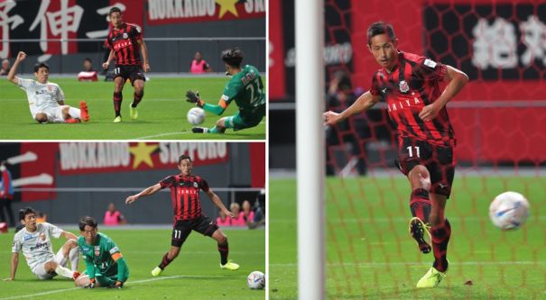 上:上段写真/前半41分、札幌FWガブリエル・シャビエル(中央奥)がDF岡村のスルーパスを受け、清水DF立田(2番)をかわしてゴール左に絶妙の先制ゴールを決める、右に札幌MFルーカス・フェルナンデス(7番)、清水DF鈴木(50番)
