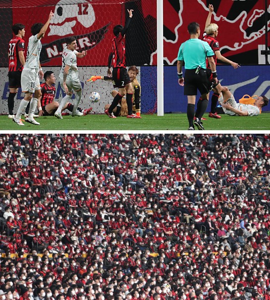 47分、ルーカスが右サイドから、中央のキム・ゴンヒに。キムは、ペナルティーエリアでフリーな青木に。青木は冷静にワントラップから右足を振り抜いた。土壇場で青木の2得点目で4−3の大逆転勝利でゲームセット。代表のGK権田でも止まらない4ゴールにドームは沸きに沸いたが、「代表? 大ジョーブかな」。