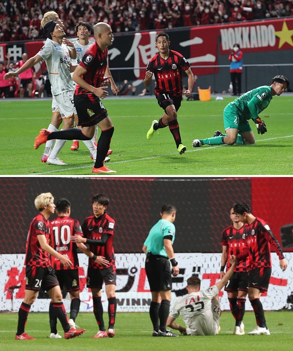 上:下段写真/前半10分、清水のFWチアゴ・サンタナ(9番)、白崎(18番)、MF中山(11番)らの攻撃に対応する札幌の選手たち、左からDF岡村、MF小柏、宮澤(10番)、菅