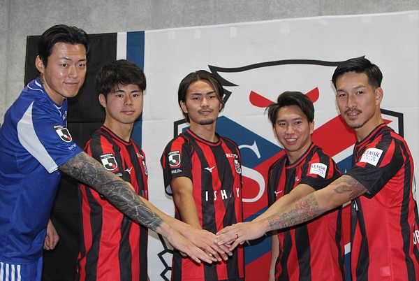 上写真/新入団選手の記者会見を終え、ポーズをとって意気込む選手たち、左から戻ってきたGKク・ソンユン、FW大森、DF馬場、MF浅野、小林