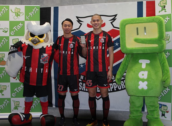 上写真/スマホによる確定申告の方法に一役買う大役を終え、記念写真に収まる荒野選手(左)と中島選手