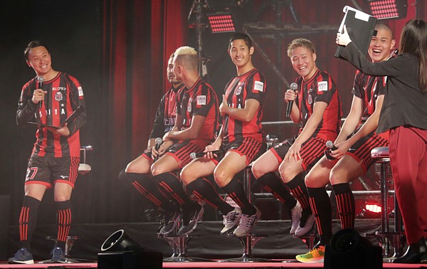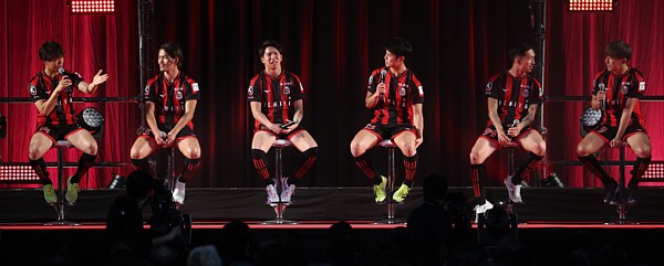 上写真/今季の新しいユニホームの着心地などを伝える選手たち、左からアウエー用のFW菅、DF田中、ホーム用のMF宮澤、GK用の菅野、ク・ソンユン、大谷