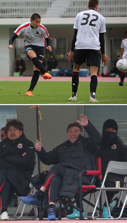上:上段写真/FC東京との練習試合でシュートを決めたFW中島、中島はこの日PKも決め2点をあげた、興梠の後釜になれるか?