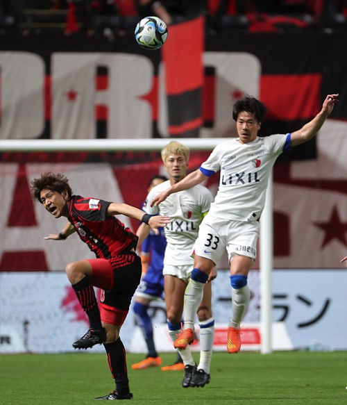 上:下段写真/前半24分、札幌MF福森のFKを鹿島FW鈴木が札幌FW小柏(19番)と競りながらクリア、CKに逃げられる、右へ札幌DF田中駿(2番)、鹿島MFディエゴ・ピトゥカ、DF植田(55番)、関川(5番)、札幌DF岡村