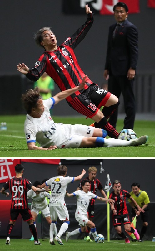 上:上段写真/後半32分、札幌MF浅野(上)が左サイドをドリブルで駆け抜けようとするが、鹿島DF広瀬にスライディングでカットされる、後方で鹿島の岩松監督がじっと見つめる
