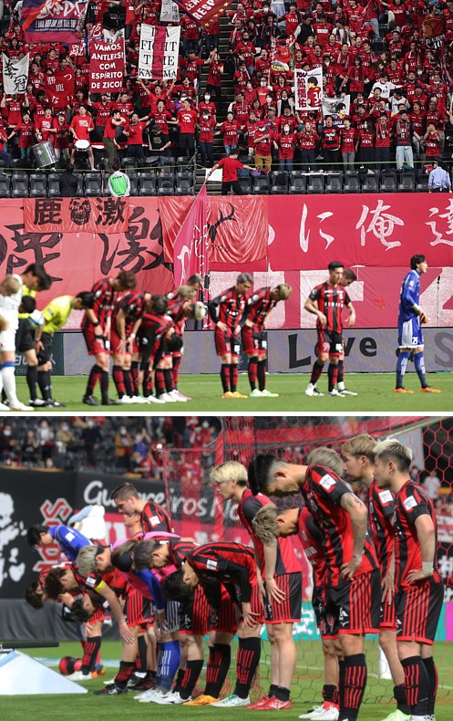 上:下段写真/0−1と鹿島に敗れゴール裏札幌サポーターにあいさつする選手たち