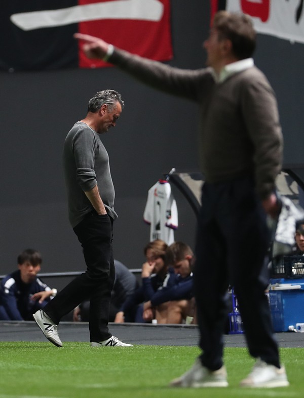 上写真/後半追加タイム6分、なお選手を鼓舞し続ける札幌のペトロビッチ監督(右)としょうぜんと肩を落とすFC東京のアルベル監督