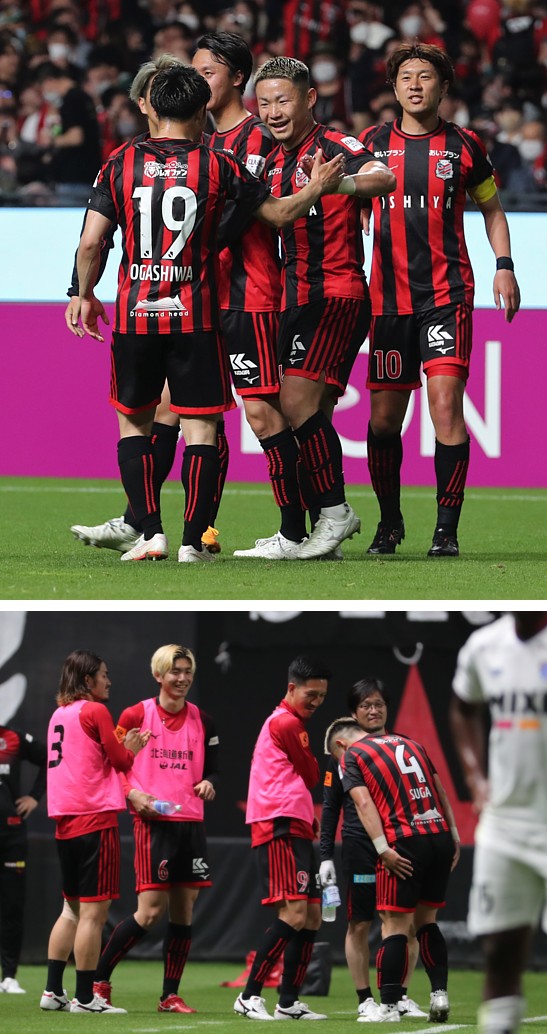 上:下段写真/前半28分、追加点を決めた札幌MF菅(4番)がピッチを横切ってベンチまで走り、MF小林(その左)に手荒な祝福を受ける、DF中村(6番)、馬場(左端)も笑顔