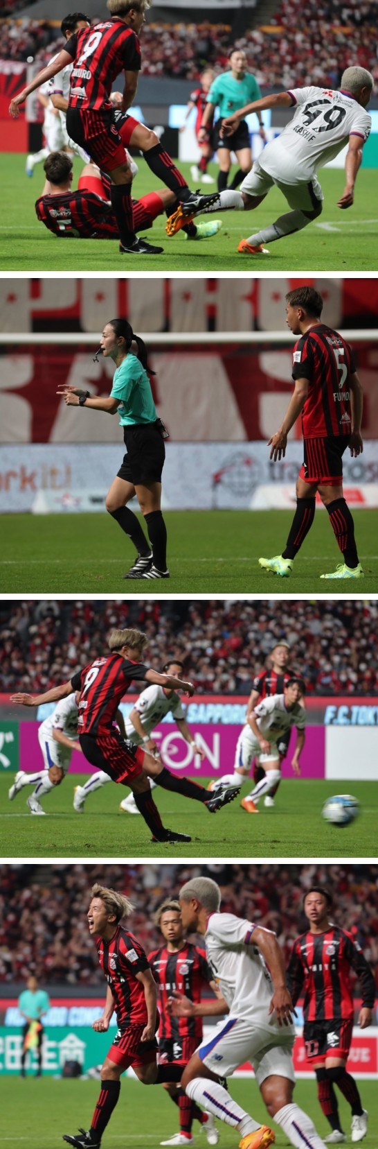 3点リードと優位に立つ札幌キックオフで後半が始まる。流れを変えたいF東京がハーフタイムに3枚替え。渡邊OUT仲川IN。ベロッチOUTオリヴェイラIN。安部OUT青木IN。F東京が徐々に立ち直り、中央の松木を中心に動き出す。札幌MF荒野に倒された松木がFK。ゴールを狙うがGK管野がパンチングし、再び札幌ボール。5分、相手陣内右サイドでボールをつないだ札幌のトップ下に入った駒井がペナルティーアーク内で左の菅へ流す。菅は中央に躍り出て右足でシュート。この日、左右の足で2得点をはじき出した。