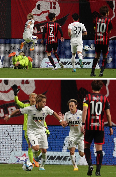 上:上段写真/前半5分、ピッチ中央付近の混戦から札幌FW小柏がドリブルで駆け上がり、前方のMF浅野へ絶妙のスルーパスを出し先制点をアシスト、後方MF宮澤