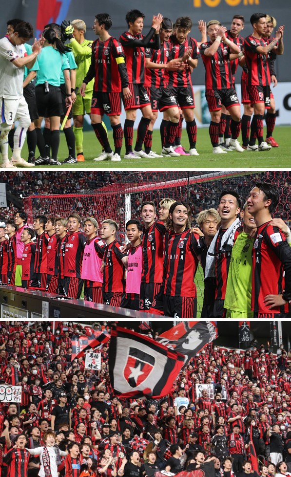 上:下段写真/FC東京を5−1で破った札幌の選手たちを大声で称えるゴール裏のサポーターたち、ボルテージが上がる一方