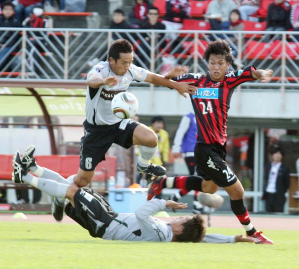 上写真/後半19分札幌は自陣からMF古田の縦パスにFW横野(24番)が飛びつくが岐阜DF秋田(6番)にクリアされる。倒れているのは岐阜DF野垣内