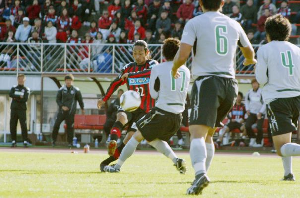 上写真/後半ロスタイム札幌MF高木(32番)が岐阜DF野垣内(17番)のマークを受けながらシュートを放つも、クロスバーの上を大きく越える。左端、札幌の石崎監督がじっと見つめている