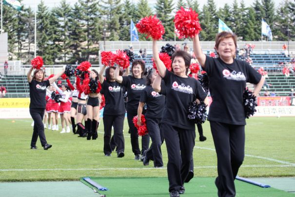 上写真/岐阜戦開始前、”月下美人”のおば様たちがコンサドールズと一緒に踊って札幌を激励、笑顔で退場する