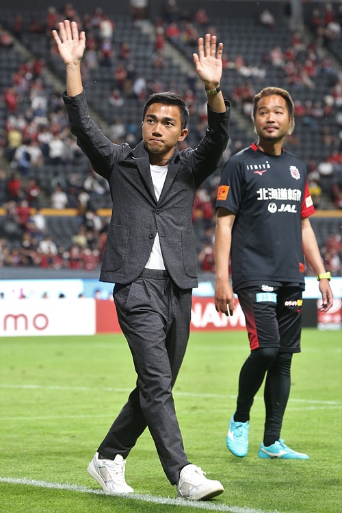 上写真/川崎フロンターレを退団し、タイに帰る元札幌のMFチャナティップが札幌ドームを訪れ、場内を一周してサポーターに別れのあいさつをした