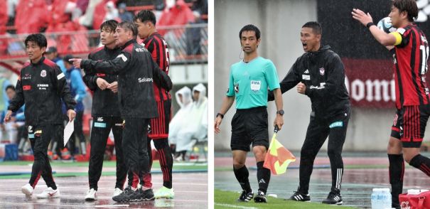 上:左側写真/後半35分、大雨の中、これから投入する札幌DF福森(右端)に杉浦コーチ兼通訳を通して指示を出すペトロビッチ監督