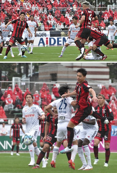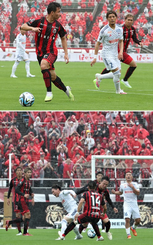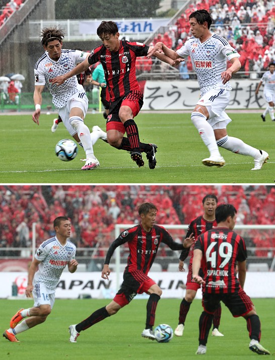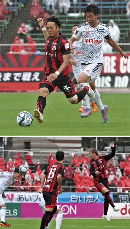 上:下段写真/後半17分、札幌MF金子が倒されて得たFKは、駒井(左)がちょこっと動かしたボールを菅がシュートしたが決まらず、足元の水滴が跳ね、ボールが走る