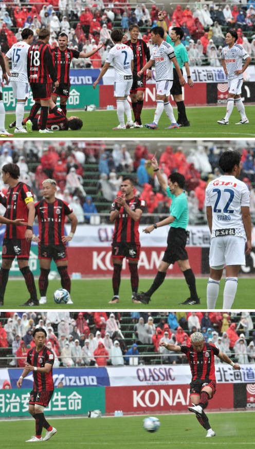 札幌はエース・金子にボールを集め、右サイドから突破。14分、金子をタックルして倒した新潟DF新井の反則でイエローカード。さらにVARの結果、主審は新井にレッドカードを提示し直し退場の判定。新潟のフィールドプレーヤーは9人になった。