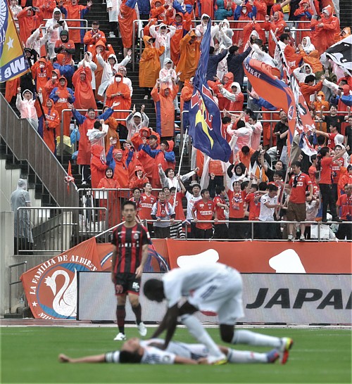 上写真/雨中のアウエーで札幌を1−0と破りピッチに大の字になって喜びを表す新潟のキャプテンMF高と走り寄るDFトーマス・デン、スタンドの新潟サポーターは最高の歓喜、その間で途中出場していた札幌MF小林はぼう然と歩く