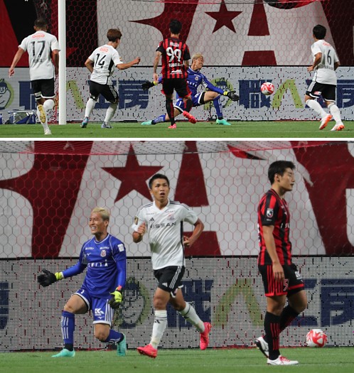 上:上段写真/後半追加タイム5分、札幌MF小柏(右)が横浜FMのGK一森(左)をかわして決勝ゴールを決める、GKの奥DF永戸