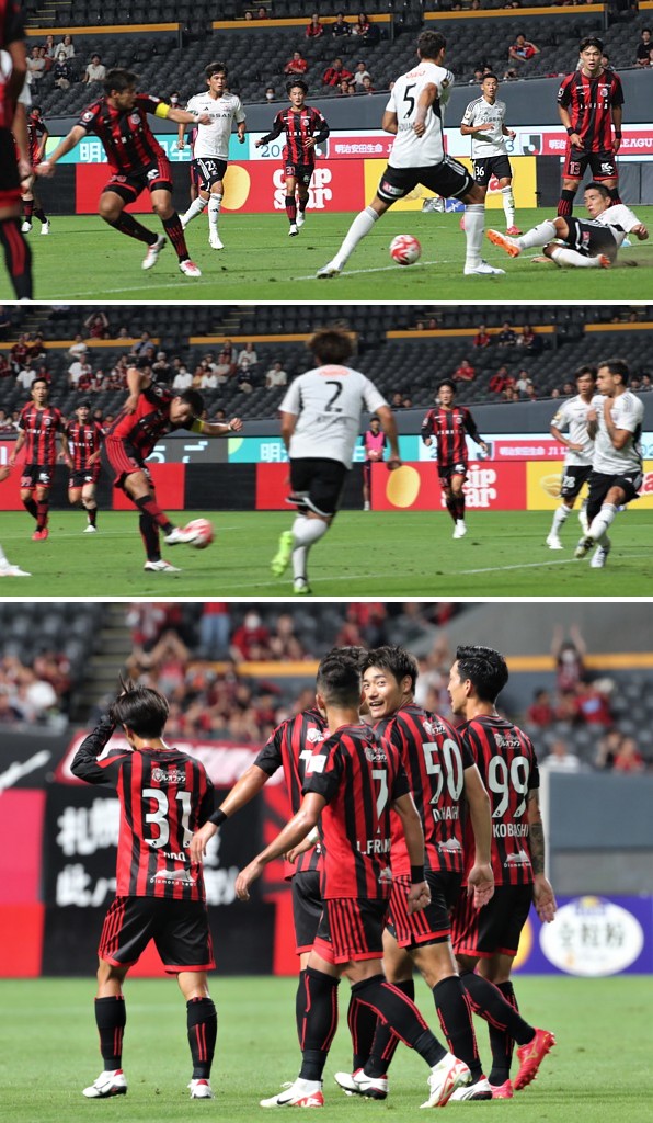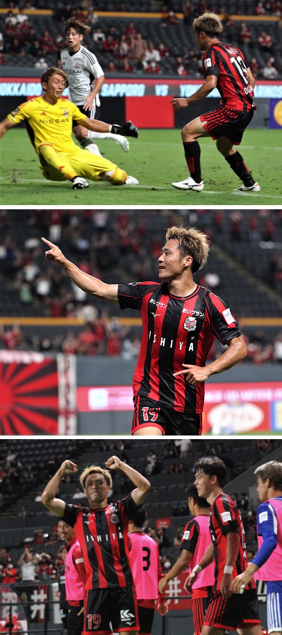 上:中段写真/後半追加タイム5分、札幌MF小柏が自身2得点目の決勝ゴールを決めゴール裏サポーターにアピール