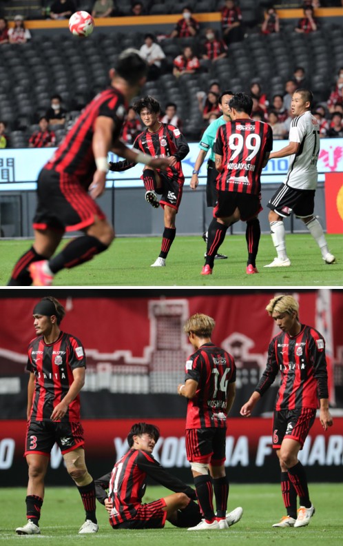 上:下段写真/前半8分、横浜FMのFW植中に先制ゴールを決められ悔しがる札幌GK菅野(左)、ガックリと肩を落とすDF岡村、中央は横浜FMのMF西村