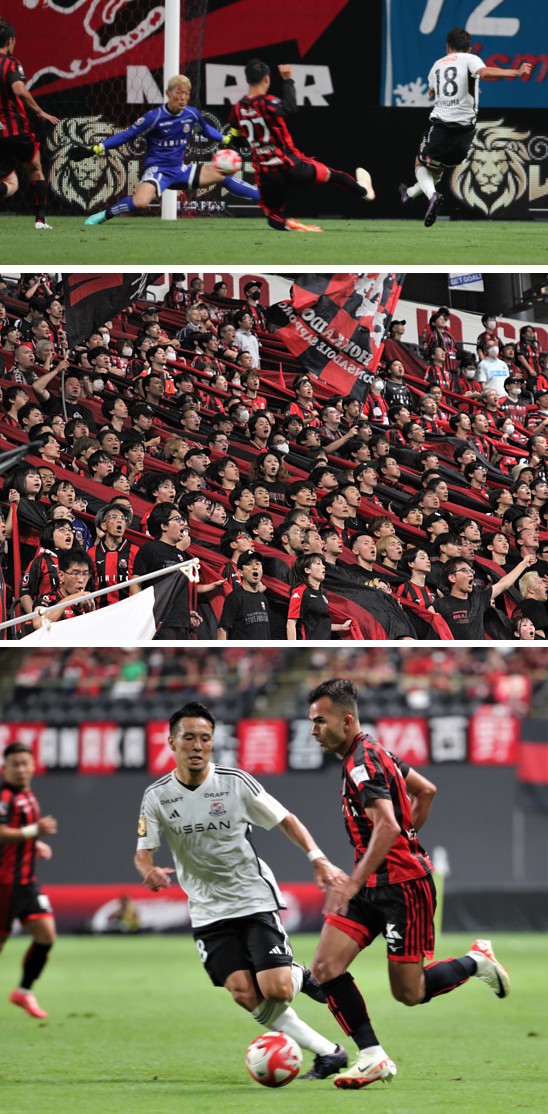 上:上段写真/前半8分、横浜FMのFW植中(14番)が井上(17番)、水沼とつないだパスを受けて先制ゴールを決める、札幌GK菅野(1番)、その手前MF小林(99番)、右端横浜FMのMF渡辺(6番)