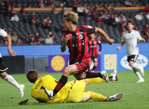 上写真/後半29分、途中出場していた札幌MF小柏が、駒井のパスに反応し横浜FMのGK一森(1番)より一歩早く押し込み同点ゴールを決める