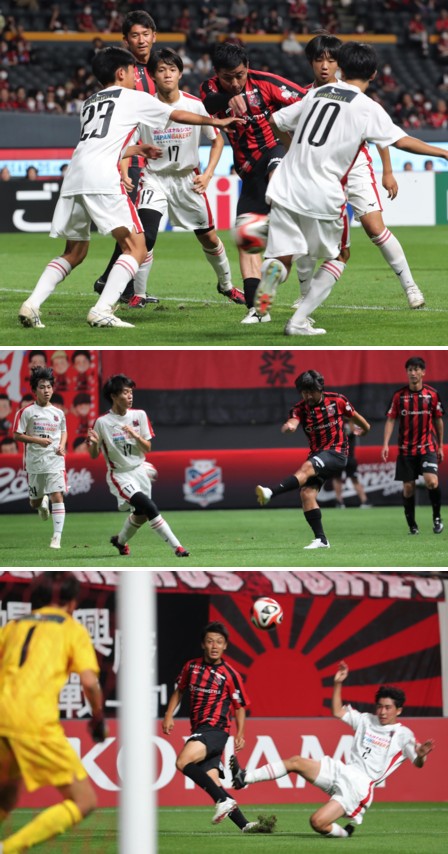 上:下段写真/吉原が先制ゴールを決めて喜ぶ、ハイタッチで迎える柴田