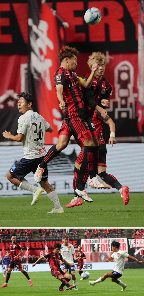 上:上段写真/開始早々の前半2分、GKからのロングボールに、MF福森(左)と初のCBに入った中村が交錯、連携が危惧された、左柏のMF山田雄(36番)