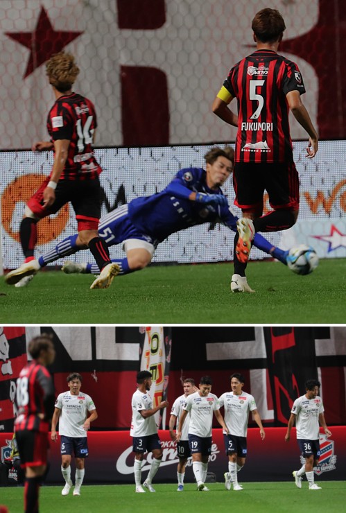 上:上段写真/前半21分、柏FWマテウス・サヴィオが札幌DF中村のパスミスを見逃さず、カットしてタテパス一本、FW細谷が右端に流し込んで先制ゴールを決める、札幌GK高木(51番)が体を伸ばすが届かず、左MF駒井(14番)、右福森(5番)