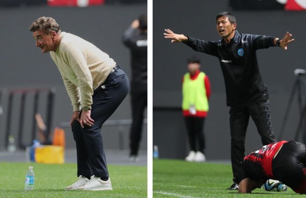上:左側写真/後半17分、お疲れか?、腰をかがめひざに手をやり戦況を見つめる札幌のペトロビッチ監督、心なしか余裕が感じられる