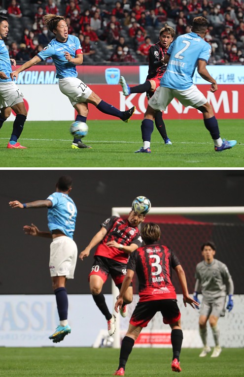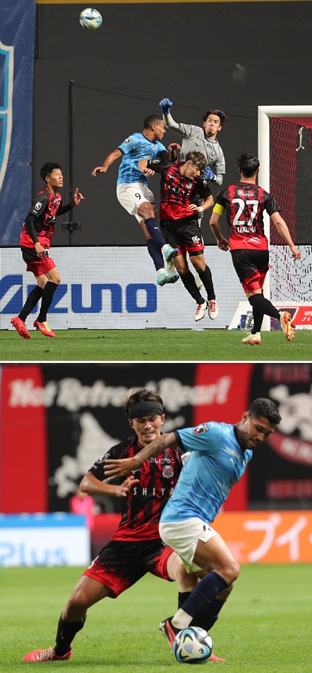 上:下段写真/後半6分、札幌DF岡村(50番)が横浜FCのFWマルセロ・ヒアン(9番)と競りながらヘッドでMF馬場(3番)へパスを出す、右奥GK高木