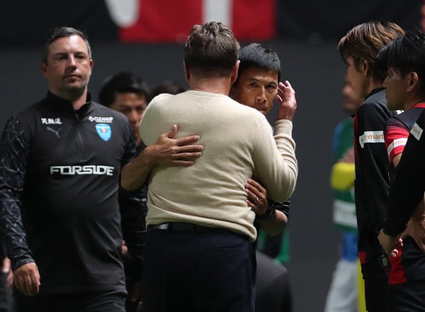 上写真/激闘を終え抱き合って健闘をたたえ合う横浜FCの四方田修平監督と札幌のペトロビッチ監督、師弟の再会だが四方田監督の表情は硬く見えた、右から2人目杉浦コーチ兼通訳、左横浜FCのジョン・ハッチソンヘッドコーチ