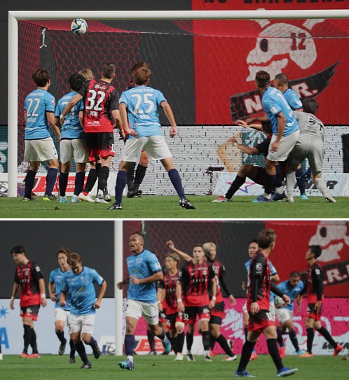 上:上段写真/後半追加タイム2分、横浜FC左CKからDFンドガ・ボニフェイス(2番)がヘディングで決め1点を返す、札幌GK高木(右端)が思い切って前に出たが間に合わなかった