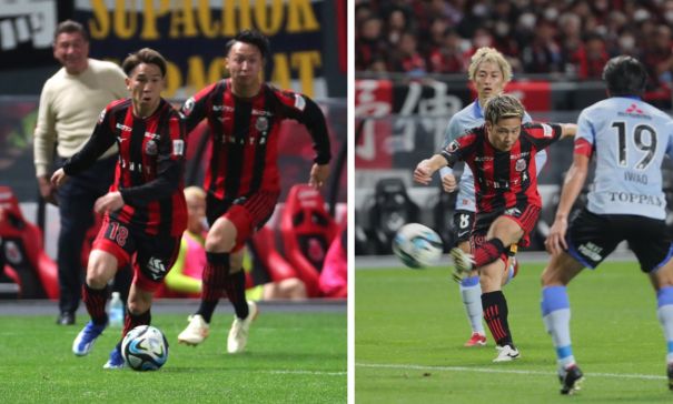 上:右側写真/前半36分、札幌FW小柏が浦和MF小泉(8番)、岩尾(19番)をかわしてシュートするが、ゴール上に大きくはずれる