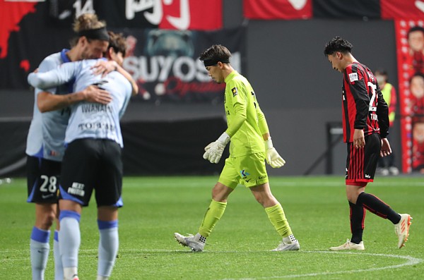 上写真/札幌を2−0と破り喜びの抱擁をかわす浦和DFアレクサンダー・ショルツ(28番)と途中出場していた岩波の脇を、小野の引退試合を勝利で飾れずしょう然と引き上げる札幌GK高木(中央)とMF荒野(右)