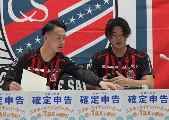 上写真/札幌中税務署によるスマホでの確定申告模擬体験に参加したコンサドーレの荒野拓馬(左)と西野奨太の両選手