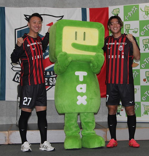 上写真/確定申告模擬体験参加後、マスコットキャラクターと記念写真に収まる荒野拓馬(左)と西野奨太