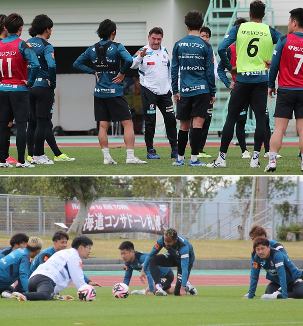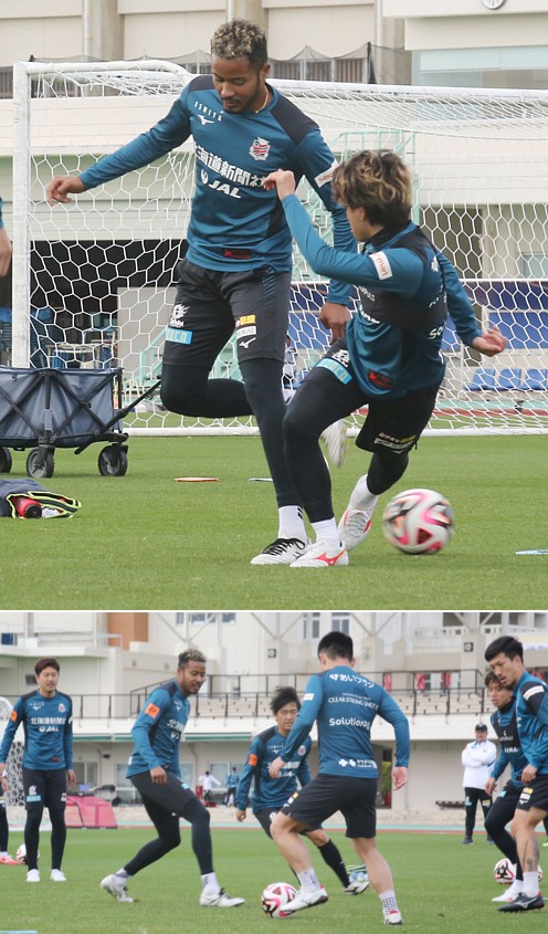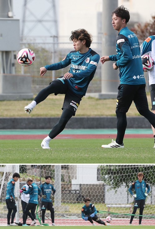 上:上段写真/ベテランGK菅野(中央)や主力選手に混じり札幌へ復帰したFW鈴木(菅野の右)らがランニングで体をほぐす