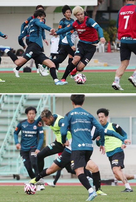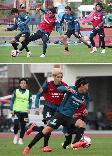 上:上段写真/激しく競り合う新加入のMF近藤(左から2人目)と練習生の札幌U−18のDF坂本、右へDF西野、新加入のMF長谷川