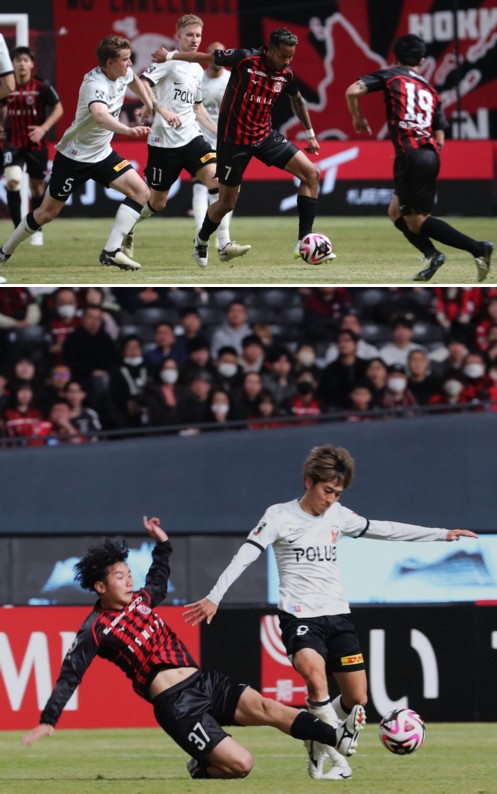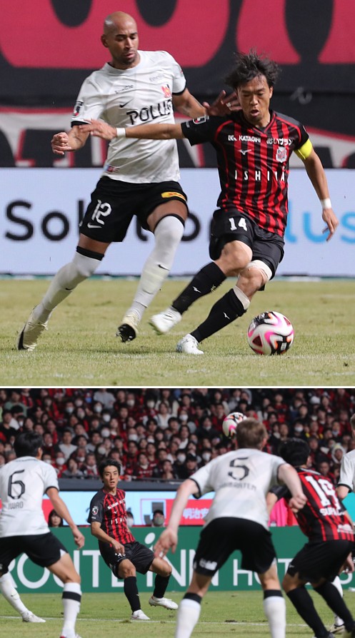 上:上段写真/前半21分、今季からキャプテンとなった札幌MF荒野(左)と浦和MF伊藤(3番)が激しくマッチアップ