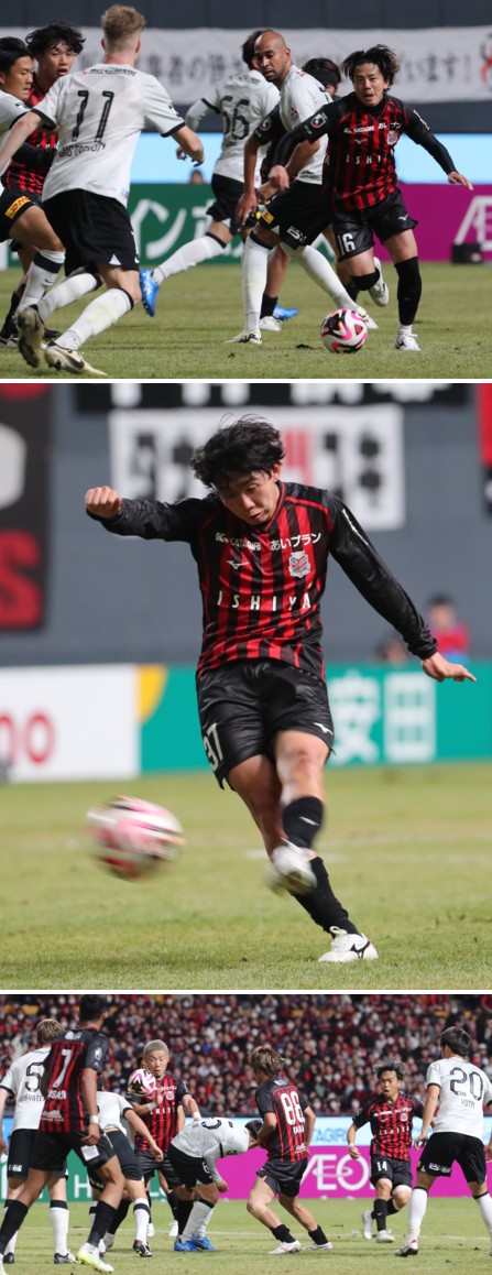 上:中段写真/後半追加タイム1分、札幌MF原が倒されて得たFKを田中克が直接狙ったが惜しくもゴール右にはずす