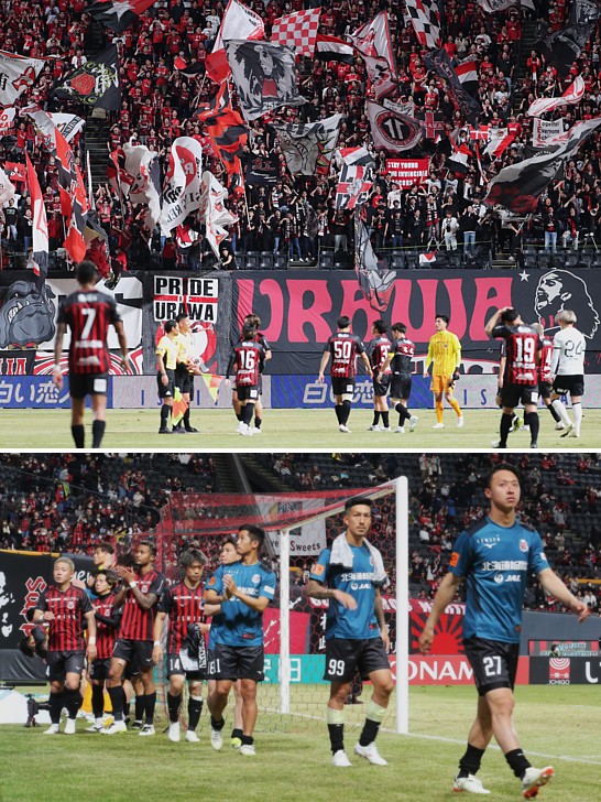 上:上段写真/札幌を1−0で破り今季初勝利をあげた遠来の浦和サポーターは大旗を振って歓喜、札幌の選手たちは肩を落とす